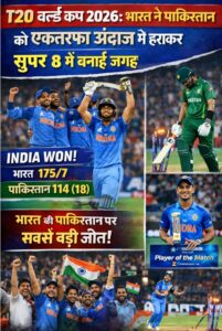 नई दिल्ली। टी20 वर्ल्ड कप 2026 में भारतीय टीम ने शानदार प्रदर्शन करते हुए चिर-प्रतिद्वंद्वी पाकिस्तान को एकतरफा मुकाबले में 61 रन से मात देकर जीत की हैट्रिक पूरी की और सुपर-8 में शान के साथ प्रवेश किया। इस मुकाबले में इशान किशन की धमाकेदार पारी ने मैच का रुख पूरी तरह बदल दिया, जिसके लिए उन्हें प्लेयर ऑफ द मैच चुना गया।